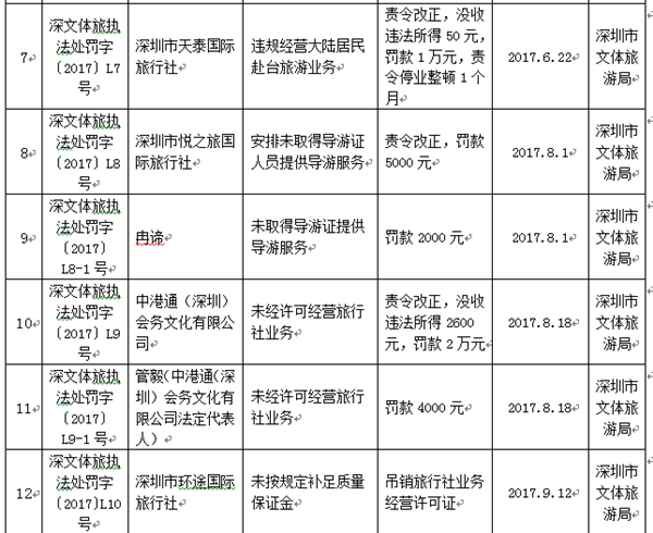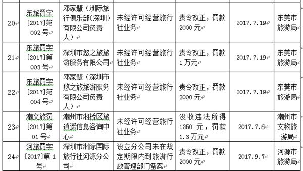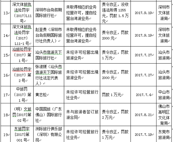 2017年第三季度,全省各级旅游主管部门共查处涉旅案件24宗,涉及14家经营旅游业务的企业和9名旅游从业人员。经研究,我局决定对以上企业和个人违法违规经营行为纳入旅游经营不良信息进行公示,公示有效时间1年(自2017年10月11日--2018年10月11日)。