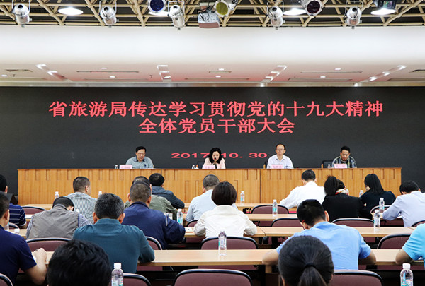 10月30日上午,省旅游局党组召开全体党员干部大会,传达学习贯彻党的十九大精神,研究部署旅游系统贯彻落实各项工作。局党组书记、局长曾颖如主持,局机关各处室、各事业单位全体党员干部参加了学习。