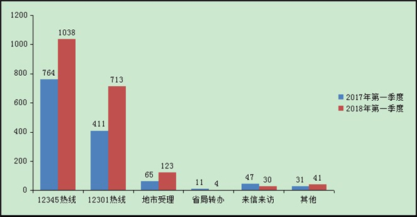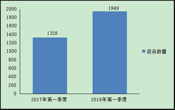 (一)投诉总量方面:今年第一季度与2017年第一季度情况相比较,投诉案件增加了620件,增幅达46.65%。