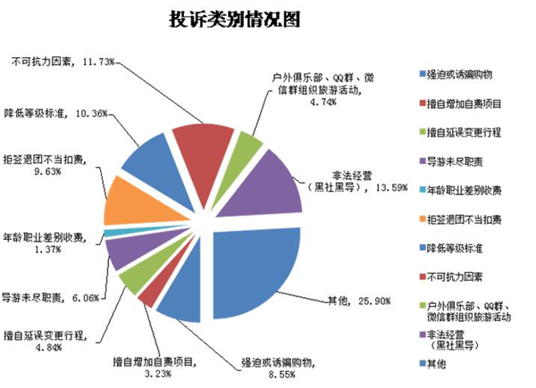 按投诉类别划分,投诉热点主要集中在:非法经营(黑社黑导)、户外俱乐部、QQ群、微信群组织旅游活动、投诉旅行社拒签后退团不当扣费、不可抗力因素和降低等级标准等问题上。其他投诉主要是签证、出境游押金、预定机票、酒店等问题引发投诉。数据显示,非法经营(黑社黑导)278宗,占全部投诉的13.59%;不可抗力因素240宗,占全部投诉的11.73%;旅行社降低等级标准212宗,占全部投诉10.36%;拒签退团不当扣费197宗,占全部投诉的9.63%;强迫或诱骗购物175宗,占全部投诉的8.55%;导游未尽职责124宗,占全部投诉的6.06%;擅自变更行程99宗,占全部投诉的4.84%;投诉户外俱乐部、QQ群、微信群组织旅游活动97宗,占全部投诉4.74%;擅自增加自费项目66宗,占全部投诉的3.23%;年龄职业差别收费28宗,占全部投诉的1.37%;其他投诉530宗,占全部投诉25.90%。