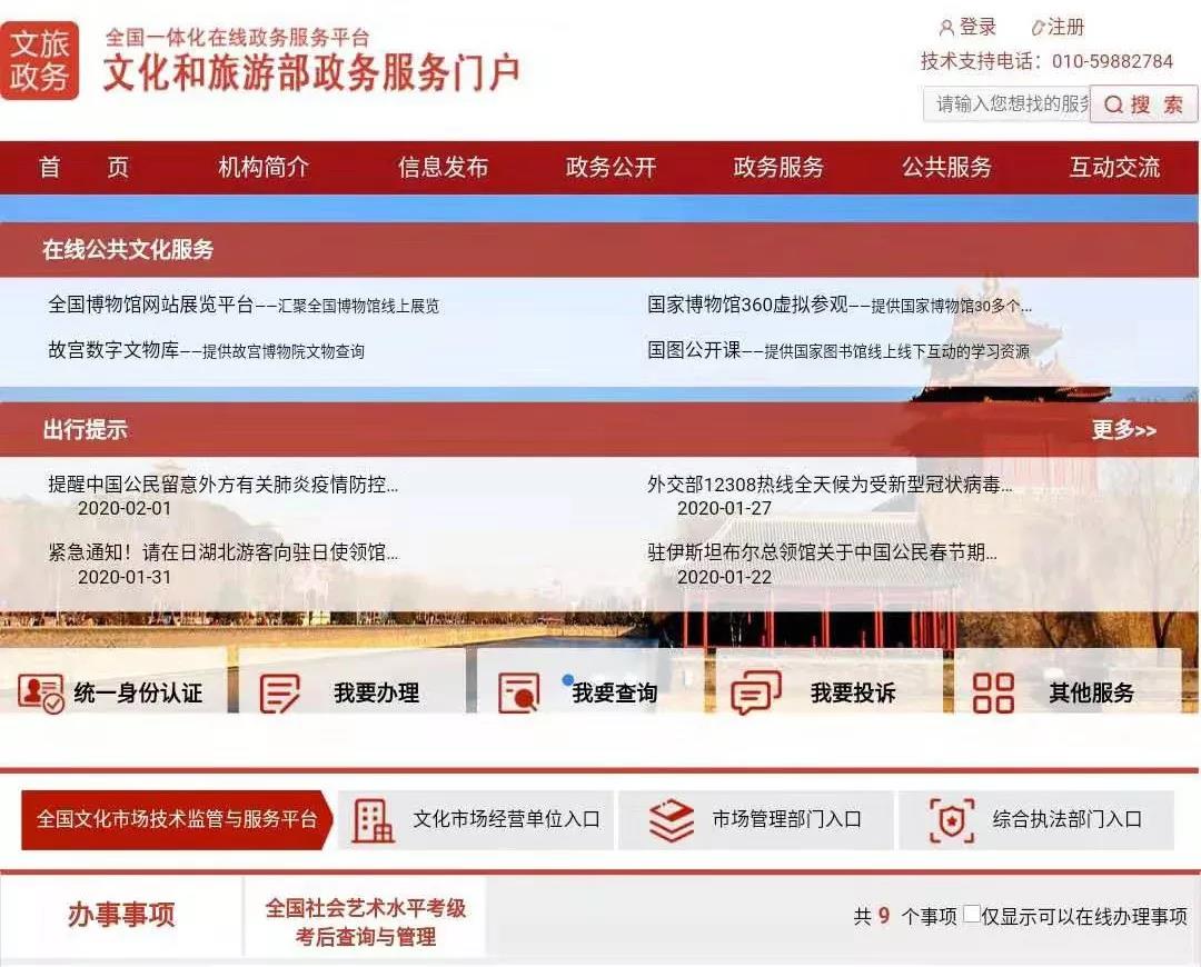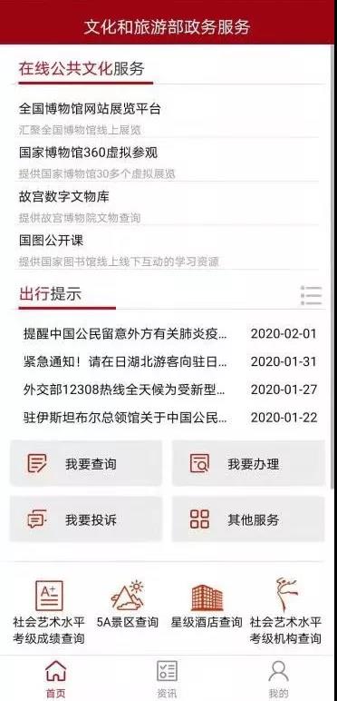 为丰富新型冠状病毒感染的肺炎疫情防控期间人民群众精神文化生活,进一步做好在线政务服务,按照国务院办公厅统一部署,文化和旅游部在国家政务服务平台、部网站政务服务门户上推出“在线公共文化服务”“出行提示”两项专题公共服务。