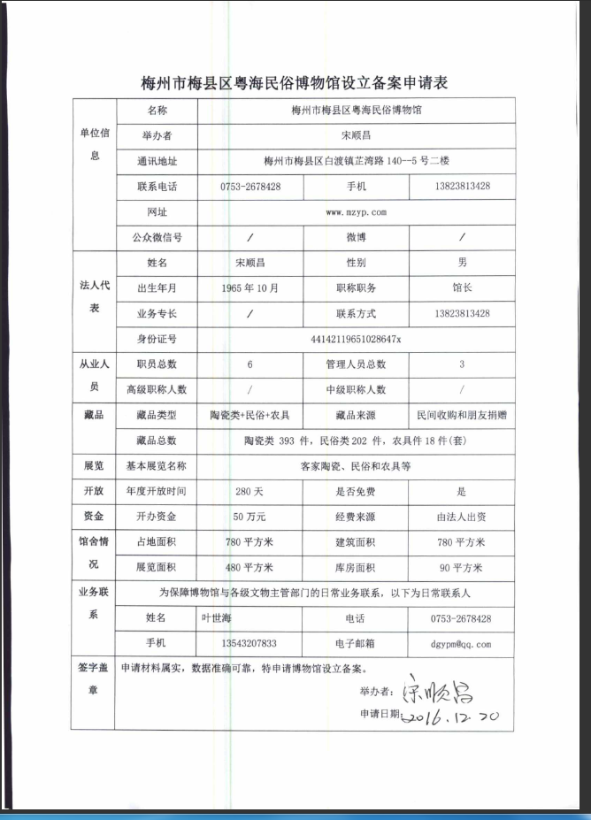 宋顺昌申请设立梅州市梅县区粤海民俗博物馆。经审核,梅州市梅县区粤海民俗博物馆符合《博物馆条例》和国家有关博物馆备案管理的规定,拟进行备案确认,现予以公示。公示期为本公示发布之日起七个工作日。如有异议,请于公示期间,以电话、传真或信函等形式向广东省文物局反映(信函以到达日邮戳为准)。