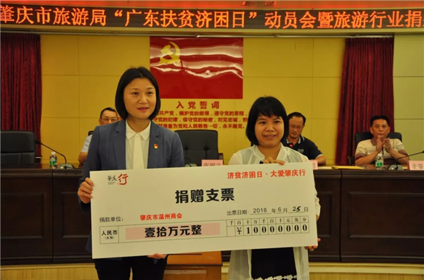 近日,肇庆市旅游局举办2018年“广东扶贫济困日”动员会暨旅游行业捐赠活动。市旅游局张丽文局长、局机关及服务中心全体干部职工和相关企业负责人共80多人参加了现场捐赠仪式。