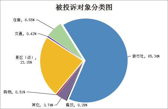 从结案案件的被投诉对象来分析,第四季度投诉旅行社1397宗,占投诉总数的65.34%,其中线下旅游企业投诉924宗,在线旅游企业投诉473宗。投诉景区(点)495宗,占投诉总数的23.15%;投诉住宿140宗,占投诉总数6.55%;投诉购物11宗,占投诉总数0.51%;投诉交通9宗,占投诉总数0.42%,投诉餐饮6宗,占投诉总数0.28%,其它投诉80宗,占投诉总数3.74%。
