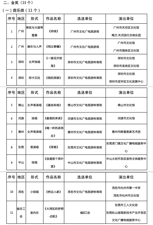 【附】2020广东省群众艺术花会(音乐舞蹈)金奖名单