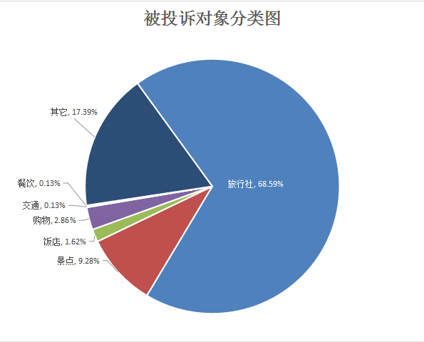 从被投诉对象来分析,对旅行社的投诉仍是重点,在线旅行社投诉上升。数据显示,第一季度,投诉旅行社1057宗,占投诉总数的68.59%,其中线下旅游投诉436宗,在线旅游投诉621宗。投诉景点143宗,占投诉总数的9.28%,投诉购物44宗,占投诉总数2.86%,投诉酒店25宗,占投诉总数1.62%,投诉交通2宗,占投诉总数0.13%,投诉餐饮2宗,占投诉总数0.13%,其它投诉268宗,占投诉总数17.39%。