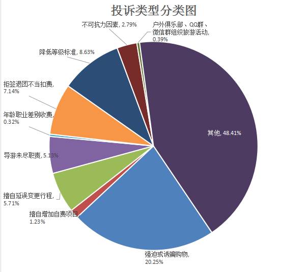 按投诉类别划分,投诉热点主要集中在:投诉旅行社强迫或诱骗购物、降低等级标准、退团不当扣费、擅自变更行程、导游未尽职责、不可抗力因素、擅自增加自费项目等问题。数据显示,投诉旅行社强迫或诱骗购物312宗,占全部投诉的20.25%;降低等级标准133宗,占全部投诉8.63%;游客退团不当扣费110宗,占全部投诉的7.14%;擅自变更行程88宗,占全部投诉的5.71%;导游未尽职责79宗,占全部投诉的5.13%;不可抗力因素43宗,占全部投诉的2.79%;擅自增加自费项目19宗,占全部投诉的1.23%;户外俱乐部、QQ群、微信群组织旅游活动6宗,占全部投诉0.39%;年龄职业差别收费5宗,占全部投诉的0.32%;其他投诉746宗,占全部投诉48.41%。