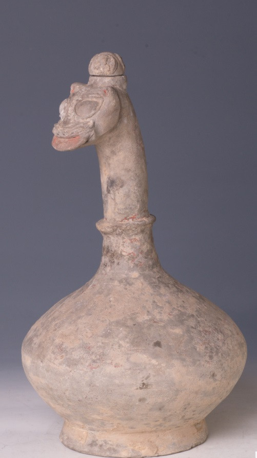 汉 兽头陶盖壶