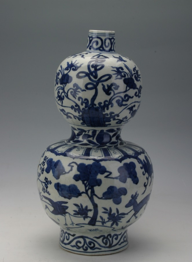 此葫芦瓶寓意长寿安康,福禄吉祥。在瓷器上利用树干盘绕呈寿、福、康、宁等字的图案是明嘉靖时期最为常见的纹饰,在嘉靖以后则较为少见。此器釉胎体匀厚,胎质洁白,白中微泛青色,青花鲜丽浓重,蓝中泛紫,是明嘉靖时期青花色料改用回青料,又称为“青金蓝”或“佛头青”,烧制呈色的典型特征。