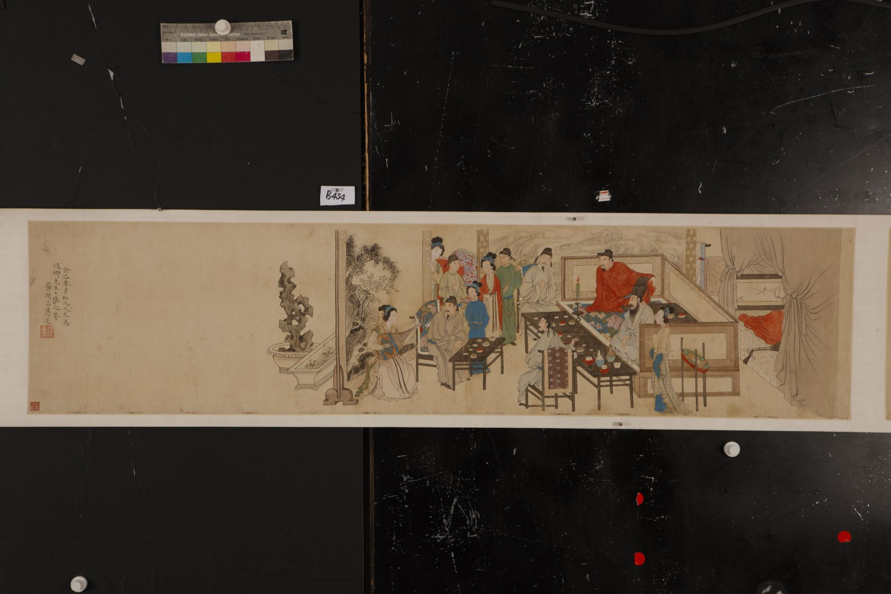 南唐(公元937-978)大臣韩熙载受到南唐后主李煜猜忌,便以声色麻痹自己,皇帝李煜遂派画家顾闳中至其家,将夜宴场面描绘下来以求其证。《韩熙载夜宴图》可分为五段,此处展出第一段画韩熙载与众宾客静听教坊副使李嘉明的妹妹弹奏琵琶。