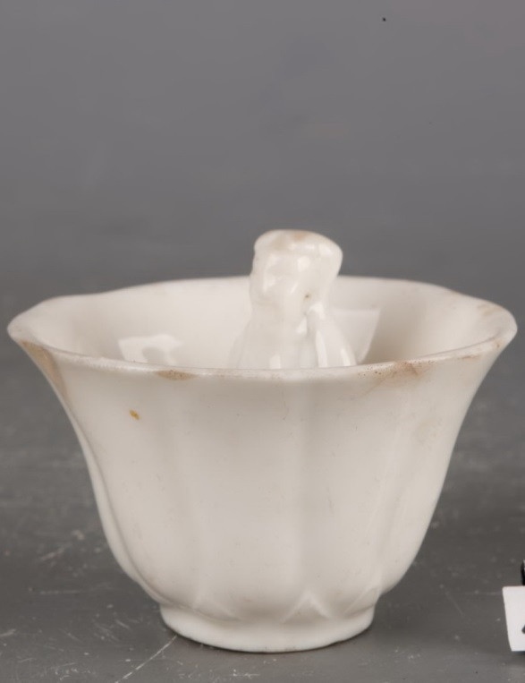 德化窑白釉公道杯杯口呈花瓣形,深弧腹、圈足。通体及圈足内均施白釉,足端无釉。杯中塑一站立的人,人体内有空心瓷管通于杯底小孔,瓷管口端与杯沿等高,立人足下与杯衔接处又有一暗孔。如注酒与人体内的空心持平,酒不能流入管内,但注酒过满时,酒高于杯中管口时,酒即随杯底的小孔一泄而出,杯中的酒就荡然无存。