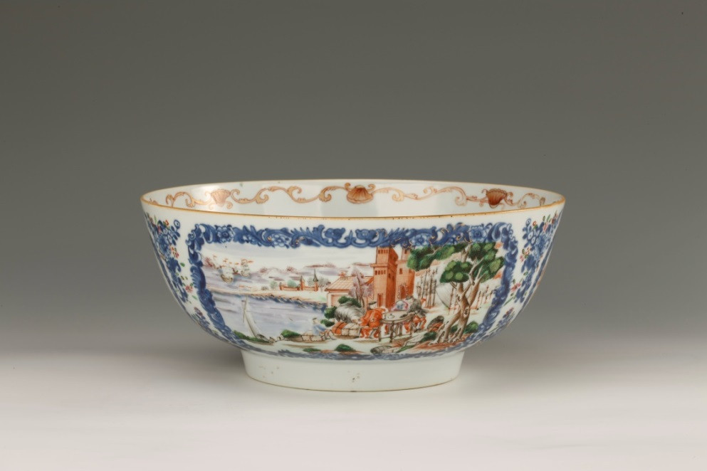 广彩洋人归航图大碗敞口,深弧腹,圈足稍高。以青花缠枝花卉绘四个开光,内绘帆船和城堡,正反两面主题纹饰各异,一面绘远洋航船从远洋归来,在码头上卸下大堆货物;另一面绘海边的一家三口,男主人牵着牛回家,妻儿跟在后面。这是把典型的中国式田园生活场景套在了西洋人身上。两个侧面开光内绘山水纹。纹饰精美,洋溢着欧洲洛可可装饰风格,色彩绚丽,画面生动有趣。