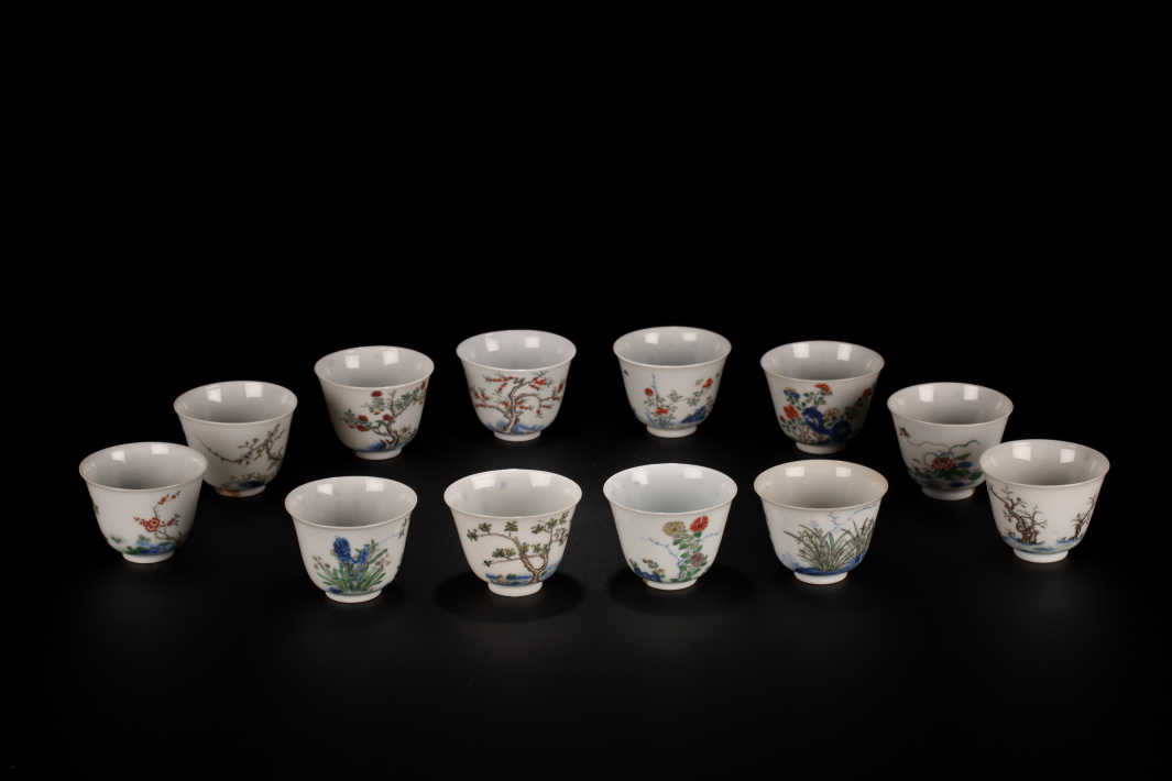 一套12件,大小相同。杯敞口,深腹,向下渐收,小圈足。造型玲珑有致,杯体通透细腻温润。器身以青花五彩绘十二月花卉纹,并题写相应的诗句。诗句皆选自《全唐诗》,用青花书写,句末落青花篆体“赏”字方章款。诗句和画面相得益彰,清新雅致。器底署青花楷体“大清康熙年制”六字双行款,外围青花双圈。